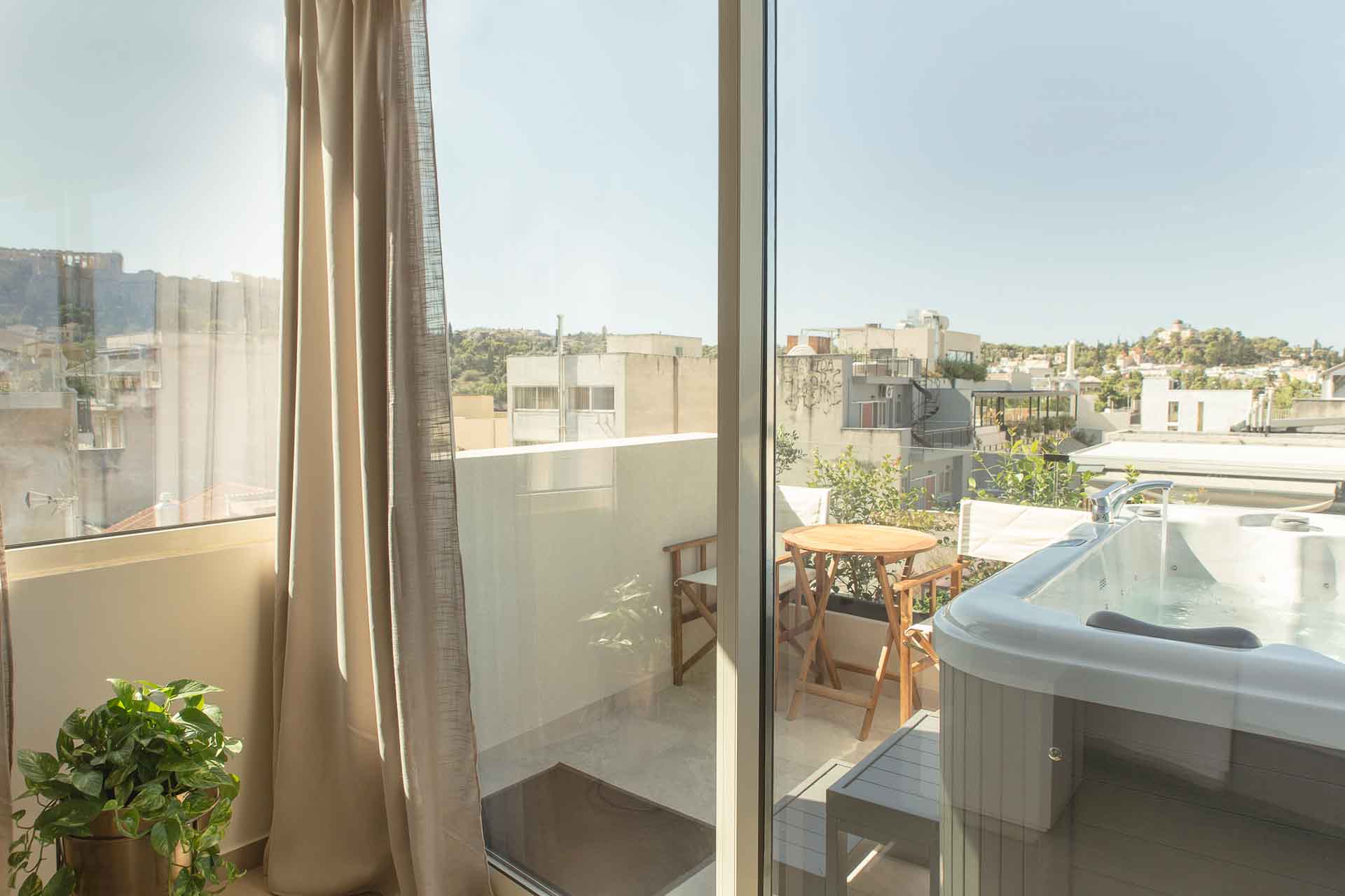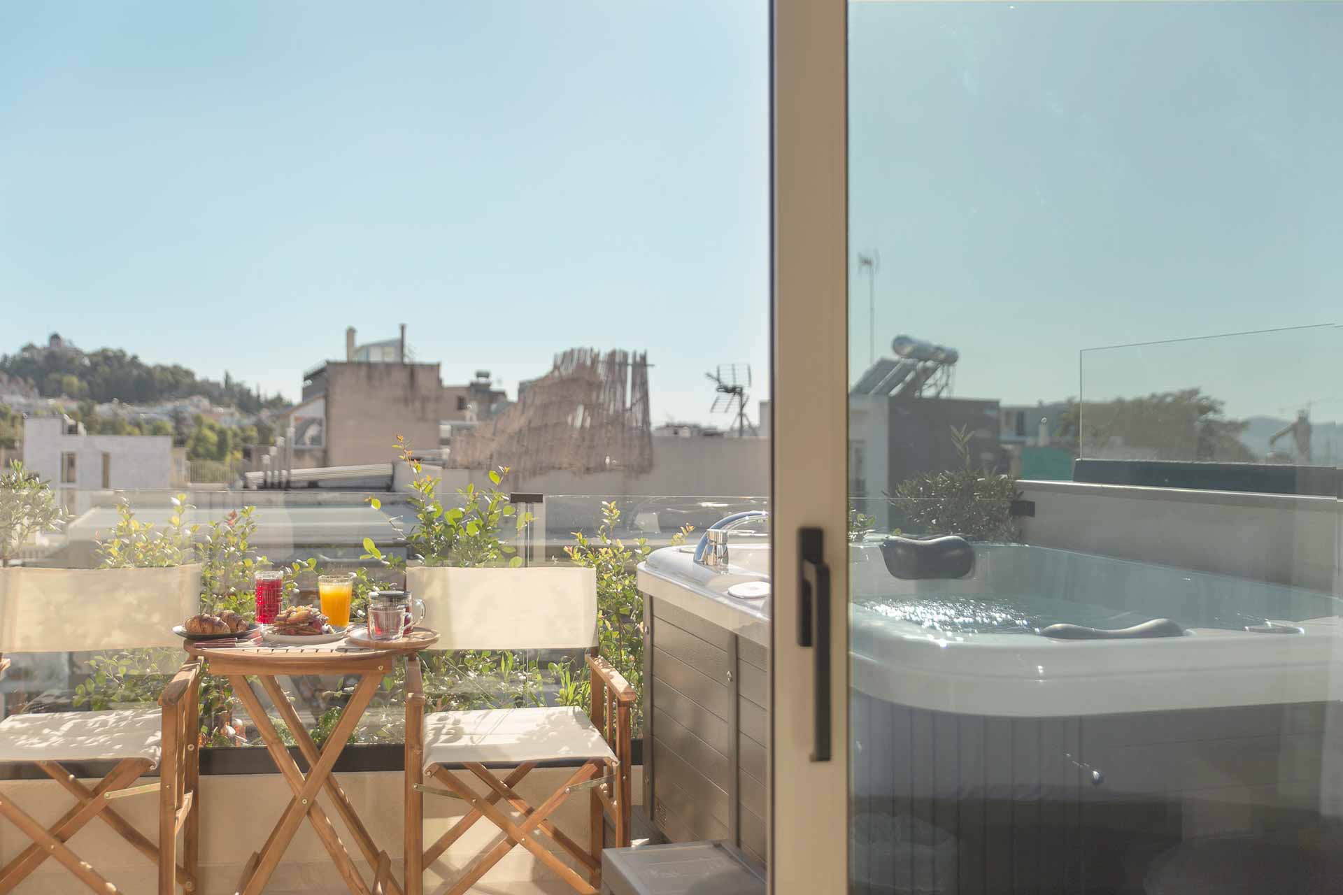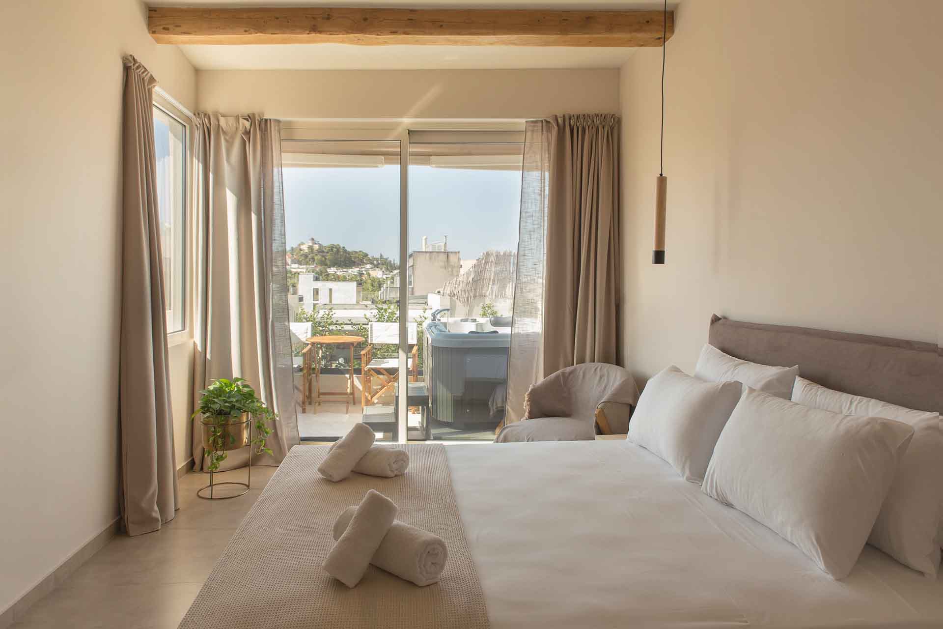 Luxury 30 sq. m. room in the center of Psyri, Athens. Having a private entrance, and amazing private Acropolis view huge 40 sqm Terrace with Jacuzzi and Amazing Acropolis view.