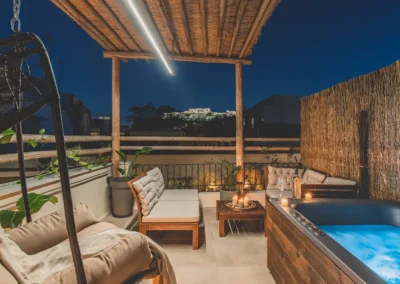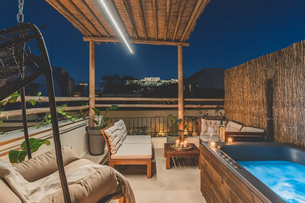Η ιδιωτική βεράντα με θέα στην Ακρόπολη με το τζακούζι είναι το πραγματικό στολίδι του διαμερίσματος, έχοντας μια καταπληκτική μποέμ ατμόσφαιρα αλλά και σε κάνει να νιώθεις VIP! Μπορείτε να μαγειρέψετε στην κουζίνα ή να παρακολουθήσετε τηλεόραση στο σαλόνι. Βγαίνοντας έξω, σε κοντινή απόσταση με τα πόδια θα βρείτε την Ακρόπολη και όλα τα άλλα σημαντικά αξιοθέατα και τα καλύτερα σημεία νυχτερινής διασκέδασης της Αθήνας! Και οι δύο σταθμοί Μοναστηράκι και Θησείο βρίσκονται σε κοντινή απόσταση, παρέχοντας πρόσβαση σε όλο το συγκοινωνιακό δίκτυο της Αθήνας.